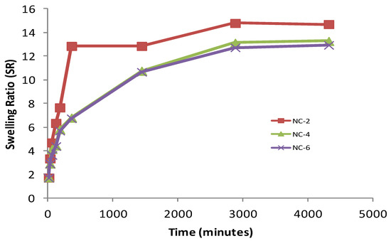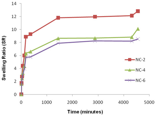 The phenomenon by which hydrogels swell in different pH allows a specific drug to be delivered to a specific site in the human body. It is well known that the basic principle on which hydrogel-based targeted drug delivery works upon is the pH-controlled swelling kinetics of the hydrogel network [48]. The clay content of the NCHs has a great influence on the water absorption capacity. The lower values of SR and % EWS of NC-4 and NC-6 can be mainly attributed to two factors.