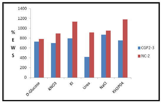 The swelling studies were carried out in irea (5% w/v), d-glucose (5% w/v), KI (15% w/v), NaCl (0.1%), KNO3, and KH2PO4 (the sources of K+) [37]. A high value of 1135.8% of % EWS was observed in the KH2PO4 solution (Figure 12). This is expected due to the different interactions of the pores of the hydrogel network with the ions of the salt. Notably, a 1000-fold higher % EWS than the initial dried weight was achieved in potassium iodide solution for the NCHs composition.