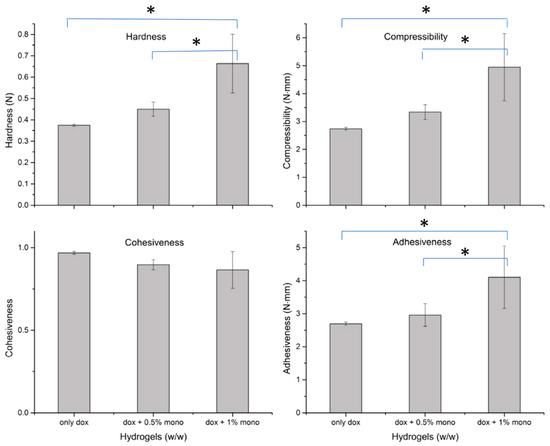 - Adhesiveness: was measured as, work required to overcome the adhesive forces between the entire surface of probe and hydrogel surface which comes in contact with the probe, while the probe is in retraction mode after the compressibility cycle or also can be defined as negative region of force-time AUC after the first cycle of compression [23,39,42,43].