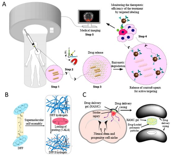 (A) Schematic view of the application of the 3D-printed micro-robotic swimmers. Micro-swimmers are directed to the disease or intervention site using an external magnetic force. Tumor microenvironment pathological condition led to the enzymatic degradation of the micro-swimmer by matrix metalloproteinase-2 (MMP-2), and boosted labeled-magnetic nanoparticle release. Antibody-modified magnetic contrast agents diffuse around to label the untreated tissue sites, Reprinted with permission from American chemical society. Adapted with permission from Ceylan et al. [33]. (B) Illustration of the composition of fibrous bola-dipeptide hydrogels for localized and sustained delivery of prodrug towards the tumor site. Adapted with permission from Zou et al. [45]. (C) Poly (lactic-co-glycolic acid) (PLGA) microparticle loaded hyaluronan/methylcellulose (HAMC) hydrogel for local drug release to the stroke injured brain tissue. The exact location of the hydrogel is held in place by both gelation and a casing comprised of polycarbonate discs. Adapted with permission from Tuladhar et al. [49].