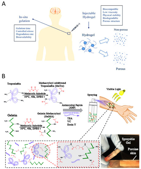 (A) Schematic illustration of injectable hydrogels in localized therapeutic agents’ delivery. It shows the required physical characteristics of the primary sol and as-injected gel for an ideal localized drug delivery depot. (B) Design and chemical composition of methacryloyl-substituted recombinant human tropoelastin (MeTro)/gelatin methacryloyl (GelMA)-AMP composite hydrogels. Schematic reaction of MeTro, GelMA, and AMP, after adding to TEA (co-initiator) and vinyl caprolactam (VC) (co-monomer) solutions. Eosin Y (photoinitiator) was finally introduced into the solution to become ready for spraying onto the wound area and exposing to visible light. Adapted with permission from Annabi et al. [69].
