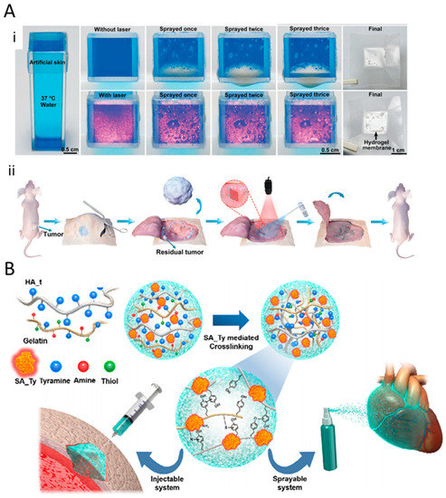(A) (i) Camera photographs of BP@PLEL hydrogel sprayed on a piece of 37 °C artificial skin with (down) and without (up) 808 nm laser irradiation. Hydrogel membrane is formed in response to the near-infrared (NIR) laser. (ii) Schematic of the surgical treatment and postoperative photo-thermal therapy of the tumor at the site of the sprayed hydrogel. Adapted with permission from Shao et al. [71] (B) Illustration of the fabrication of sprayable system comprising hyaluronic acid (HA) hydrogel, crosslinked with SA-Ty mediated macromolecules (gelatin, HA_t), coupled with a neighboring amine, thiol, and another quinone. Adapted with permission from Kim et al. [72].
