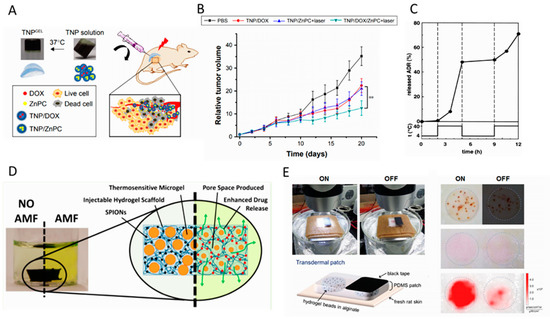(A) Illustration of photo/chemo combination therapy via in situ formed thermal-sensitive polymer hydrogel (TNP) in a xenograft tumor model. Doxorubicin and zinc phthalocyanine loaded TNP polymer solution is transformed to gel state after injecting, to be used for localized photodynamic therapy. Adapted with permission from Huang et al. [77]; (B) relative tumor volume of the mice model in different treatment conditions showing the significance of concurrent localized chemo/PDT therapy. Adapted with permission from Huang et al. [77]. (C) Thermal fluctuations and corresponding on/off switch release of drug from thermo-responsive PIPAAm-PBMA micelles through the low critical solution temperature (LCST). Adapted with permission from Chung et al. [82]. (D) Hydrazide-functionalized poly N-isopropylacrylamide (PNIPAAm) microgels in a magnetic nanoparticle-containing matrix using for pulsatile on/off release of drugs in response to an external magnetic field. Adapted with permission from Campbell et al. [83]. (E) Ex vivo setup of the light-triggered release of the skin patch with drug reservoirs containing rhodamine-loaded hydrogel beads. It is shown that by the exposure of the visible light (LED lamp (30 mW·cm −2) for 6 h), rhodamine is released from the Polydimethylsiloxane (PDMS)skin patch, which is significantly higher than that of “off “condition. Adapted with permission from Kim et al. [89].