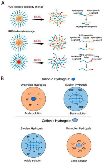 (A) Schematic of reactive oxygen species (ROS)-sensitive drug delivery mechanism including ROS-mediated solubility change and ROS-mediated cleavage of hydrogels. Adapted with permission from Tu et al. [108]. (B) Schematic of pH-responsive swelling of anionic and cationic hydrogels in acidic and basic solutions.