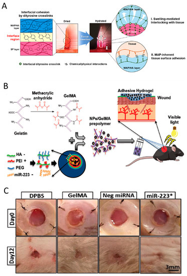 - Saleh, B.; Dhaliwal, H.K.; Portillo-Lara, R.; Sani, E.S.; Abdi, R.; Amiji, M.M.; Annabi, N. Local Immunomodulation Using an Adhesive Hydrogel Loaded with miRNA-Laden Nanoparticles Promotes Wound Healing. Small 2019, 15, e1902232. [Google Scholar] [CrossRef]