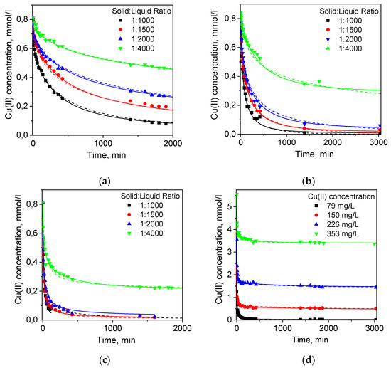 Kinetic curves of Cu(II) ion sorption from 1 M NH4OAc solution on the (a) PEI gel beads; (b) PEI cryobeads; (c) PEI gel fines); (d) PEI cryobeads fines. Dots—experimental data; dashed lines—RCD model; solid lines—RCD-diffusion model.