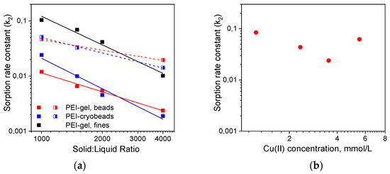 Constants of Cu(II) ions sorption rate (g·mmol−1 min−1) on PEI-gels and PEI cryogel: (a) Cu(II) concentration 50 mg/L, linearization using PSO model was executed for the timespan 3000 min (closed symbols, solid lines) and in the timespan corresponding to Cu(II) adsorbed amount of 0.5 mmol/g (half-open symbols, dash lines); (b) Cu(II) sorption on PEI cryobeads at solid:liquid ratio 1:1000, linearization using PSO model was executed for the timespan 3000 min.