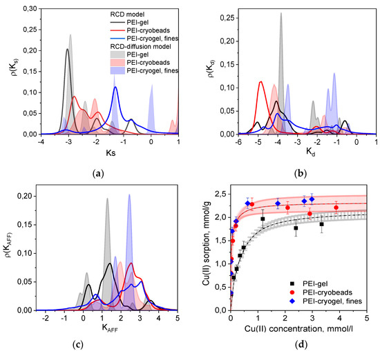 Figure 3 shows several types of distribution functions calculated from the RCD functions found for PEI gel, PEI cryobeads, and fines of PEI cryogel from the kinetic curves depicted in Figure 1. The RCD model confirms general trend, which was found by applying the PSO model: the Cu(II) sorption rate constants on beads of PEI gel and PEI cryogel differ much less in comparison with fast sorption on fines of PEI cryogel. Comparison of the distribution function for the sorption (Figure 3a) and desorption (Figure 3b) rates constants shows that regardless of the porosity and the bead size several types of sorption centers can be identified. Slow sorption centers with Ks (logks) < −2.5, which dominate for PEI gel beads, were also found for fines of PEI cryogel. Distribution functions for constants of desorption rates (Kd) clearly show the presence of two types of sorption centers, which can be denoted as low affinity (high Kd) and high affinity (low Kd). To simplify the comparison between kinetic properties of the materials, the weighted average sorption and desorption RC were calculated and summarized in Table 1. Since “fast” sorption sites with high Ks can be of low or high affinity, the affinity constant (KAFF = Ks/Kd) distribution function (Figure 3c) provides better visualization of the sorption centers characteristics. Diffusion limitations affect both sorption and desorption rates; therefore, the differences between the affinity constants for PEI gel, cryogel, and fines becomes significantly lower than can be assumed from Ks-distribution functions for these materials. Since the RCD function provides complete information on sorption capacities and affinities of sorption centers, it can be used to calculate full theoretical sorption isotherms using Equation (3). Figure 3d shows very good correlation between experimental and calculated isotherm of Cu(II) ion sorption on PEI gel, cryogel, and fines. Since the isotherm corresponds to the equilibrium state of sorption, no difference was observed for PEI cryobeads and PEI cryogel fines. PEI gel has lower sorption capacity due to higher cross-linking degree at room temperature.