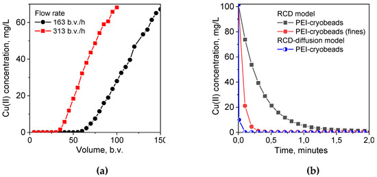 As we have mentioned above, the important advantage of the RCD model is the possibility to predict sorption kinetics at any arbitrary conditions, including sorption at low solid:liquid ratio corresponding to the sorption dynamics on monolith cryogel in column, using RCD functions calculated from experimental kinetic curves. In this case, simulated kinetic curves can be used to determine the minimal residence time of solution in sorption column required to reach certain degree of the adsorbate uptake. The experimental breakthrough curves for Cu(II) ion sorption on monolith PEI cryogel (Figure 4a) show that ~100% uptake of Cu(II) ions was achieved at very high flow rates—163 bed volume (b.v.)/h and 313 b.v./h corresponding to the residence time of the adsorbate in the column of 0.35 min and 0.19 min, respectively. However, simulated kinetic curves for Cu(II) ion sorption on PEI cryogel for the same sorption conditions as in column (solid:liquid ratio, sorbent weight, and Cu(II) concentration) showed that expected Cu(II) uptake would be only 65% for the flow rate of 163 b.v./h and 45% for 313 b.v./h, if PEI monolith had kinetic properties of PEI cryobeads (Figure 4b). This confirms serious diffusion limitation for the sorption on cryobeads in batch. The kinetic curve simulated using RCD function for sorption on fines of PEI cryogel gives significantly better prediction of the minimal Cu(II) residence time in column for ~100% uptake but still overestimates it in comparison with the experimental data.