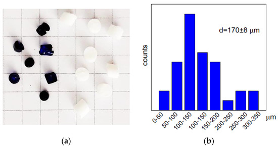 PEI was cross-linked in 5% solution (pH 10) with 1,4-butanediol diglycidyl ether at molar ratio to PEI (monomer unit) 1:4 as described in detail in [27]. To fabricate monolith PEI cryogel, a PEI solution with cross-linker agent was placed into insulin syringes with inner diameter of 4.8 mm and kept frozen at −20 °C for 7 days. After thawing, the monolith cryogels were washed with distilled water using a peristaltic pump (Ismatec, Wertheim, Germany) to remove unreacted chemicals and sealed in the swollen state until used. To obtain cylindrically shaped beads, after addition of the cross-linker, PEI solutions were placed into plastic tubes of the inner diameter of 3.6 mm and kept frozen at −20 °C for 7 days for PEI cryobeads or at room temperature for PEI gel. Cross-linked PEI cryogels and gels were removed from the plastic tubes, washed with deionized water, cut to the cylinders of a length of ~3 mm, and dried at room temperature. Swelling of the cross-linked PEI cryobeads and gel beads was determined from the difference in weights of the swollen for 24 h in distilled water and dry material—1700% and 300%, respectively. After re-swelling during sorption cryobeads completely recovered the size of beads, while dried gel beads slightly shrank. Figure 5a shows the photo of PEI cryobeads and gel beads with average size 0.35 ± 0.03 cm and 0.26 ± 0.02 cm, respectively. The cryobeads fines were obtained by ultrasound treatment of the swollen PEI cryobeads and characterized using optical microscopy and ImageJ software [49] to calculate the particle size distribution (Figure 5b). The structure of the swollen (never dried) and stained with fluorescein PEI cryogels was investigated using a Carl Zeiss LSM 780 confocal laser scanning microscope (Oberkochen, Germany), the average pore size was 128 ± 30 μm (Figure S2, Supplementary Materials).