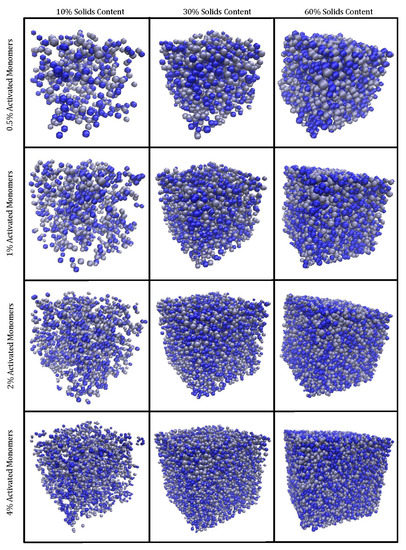 Visualisation of these three-dimensional structures is important not only for a comparison between the different simulated materials, but also for visual comparison with materials synthesised experimentally. The 3D structures from this simulation are visualised using Visual Molecular Dynamics (VMD) software, with each primary cluster represented by a sphere, the coordinates of which are taken from the lattice and inserted into a VMD-readable file format. The average number of monomers within each primary cluster was taken to be an equivalent spherical volume, and the average equivalent radius was subsequently determined and used to visualise the clusters as spheres. In this way, a structure that is easy to visualise, while reflecting the most important characteristics in terms of primary particles and the aggregated gel structure, is generated.