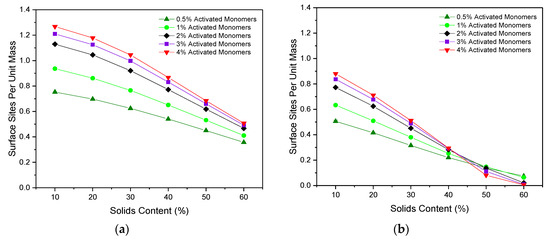 Accessible surface sites scaled with total mass with varying solids content () and activated monomer () values with respect to a diffusing particle of (a) Size 1 and (b) Size 3. Standard deviation error bars are present around each data point, although may not be visible due to their size relative to the data point marker.