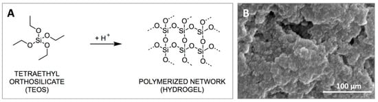 Tetraethyl orthosilicate (TEOS)-based hydrogel formation. (A)—reaction mechanism; (B)—nanoparticular structure of the hydrogel.