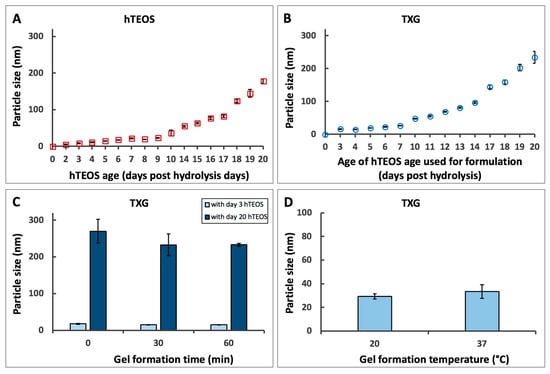 Hydrogel (TXG) formulation effects. (A)—time-dependent particle size analysis of hydrolyzed TEOS (hTEOS); (B)—particle size analysis of TXG formulated with different age hTEOS; (C)—short time effects of hTEOS age on TXG particle size (ANOVA analysis for day 3 hTEOS indicated no statistically significant differences: p = 0.076 for alpha = 0.05, F = 4.086 and F crit = 5.143; ANOVA analysis for day 20 hTEOS indicated no statistically significant differences: p = 0.989 for alpha = 0.05, F = 0.011 and F crit = 4.786); (D)—effects of TXG formation temperature on its particle size (no statistically significant differences, TTEST p = 0.3).