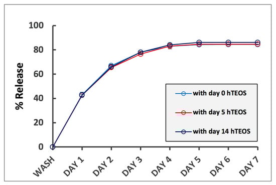 Effect of hTEOS age on the drug release rates from TXG. Error bars are hidden in the plot symbols when not visible.