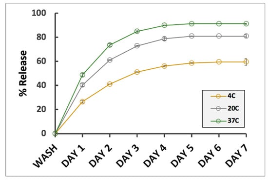 Temperature effect on drug release rates from TXGs. Error bars are hidden in the plot symbols when not visible.