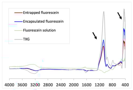 Our data indicate that the drug encapsulated in the TXG constituent nanoparticles is released at a significantly lower rate than the drug entrapped in the aqueous solution between the TXG constituent nanoparticles. Our assumption regarding the different fluorescein incorporation into the thixogels via the aforementioned mechanisms was further confirmed by Fourier-transform infrared spectroscopy (FTIR). As postulated based on fluorescein’s chemical structure analysis, the FTIR spectra indicate the simple presence of the drug in the thixogels and the lack any new peaks corresponding to potential physical or chemical interactions between the model drug and silica network (Figure 7). Moreover, in agreement with our proposed drug localization based on the thixogels’ formulation mechanism, the TXG with the aqueously distributed fluorescein shows stronger signals for the model drug molecule (indicated by the arrows), compared to the encapsulated version, in which the Si–O–Si signals are stronger and the fluorescein signal is more shielded [28,29]. Overall, our data confirm the different compartmentalization of the drug in the two formulations, and highlights yet another thixogel property that can be tailored simply through the formulation of the material.