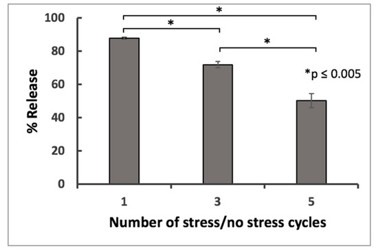 Impact of the number of stress/no stress cycles on the drug release rates from TXGs.