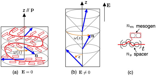 Figure 1 shows a schematic representation of a side-chain liquid crystalline polymer between two crosslinks on a elastomer (or gel). In the phase without the external field , the director is twisted along the pitch axis (z axis) with a pitch length p and the director is perpendicular to the pitch axis (Figure 1a). When the external field, such electric or magnetic fields, applies along the helix axis of a Ch phase, the director rotates along the pitch axis with a cone angle (Figure 1b). This phase is called a heliconical cholesteric () phase. Such an oblique helicoidal cholesteric phase induced by the electric field has been observed in banana-shaped liquid crystalline molecules [23].