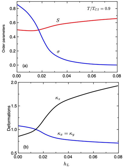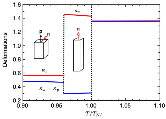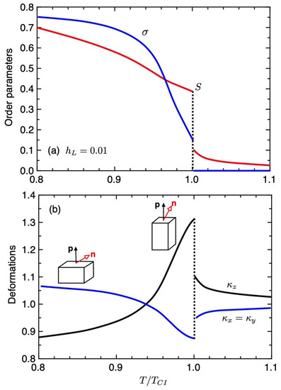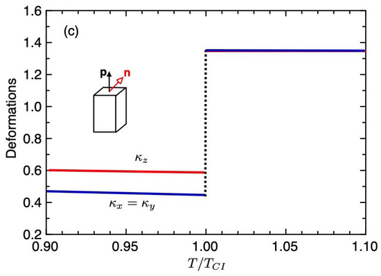 Figure 3 shows the order parameters and S (a) and the deformations (b) under the weak external field plotted against the temperature . At hight temperatures of , the value of S is small and it corresponds to the para-nematic phase (, or weak nematic phase. We here refer to it as the phase because of . At , we have the first-order phase transition, where the order parameters S and jump. As shown in Figure 3b, the values of the deformations jump at and the value of decreases with decreasing temperature. Near the phase transition temperature, the value of the order parameter is small and then the elastomer extends to parallel to the pitch axis (z axis): and . It corresponds to an prolate shape of the elastomer. However, on decreasing temperature, the value of increases and the elastomer causes the spontaneous compression () in the pitch axis and elongates equally in the x and y directions (). We then have and the elastomer shows an oblate shape at low temperatures. When at , we have . The shape of the elastomer is changed from prolate with to oblate with decreasing temperature. The pitch wavenumber Q of the phase is inversely proportional to : see Equation (39). As discussed in the previous paper [17], when without the external field, we have and the elastomer shows an oblate shape.