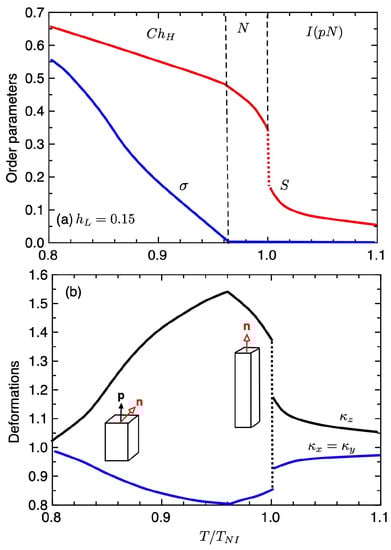 Order parameter S and as a function of the temperature (a) and deformations under the external field plotted against the temperature , where shows the temperature of the first-order phase transition (b). The cholesteric elastomer causes the spontaneous elongation in the pitch axis near the transition temperature . With decreasing temperature, the value of decreases and the value of increases.