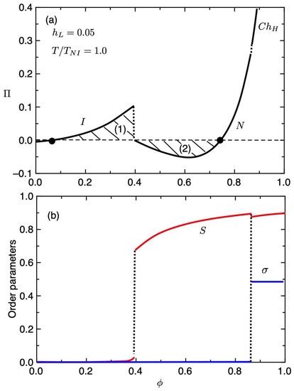 The total free energy F is given by the sum of Equations (5), (26) and (46). Apparently, when , or an isotropic phase, the free energy (46) becomes zero.