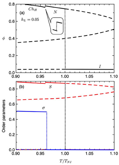 Order parameter S and as a function of the temperature (a) and deformations under the strong external field plotted against the temperature , where shows the temperature of the first-order phase transition (b). The N phase with and appears between the and phases.
