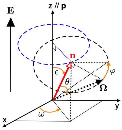where E shows the strength of the external field. When the dielectric anisotropy is positive: , the liquid crystal molecules tend to orient along the external field. The longitudinal fields, or longitudinal deformations, along the helical axis z can swing the director along the pitch axis . With the cone angle of the director measured from the pitch axis , the director rotates out of the perpendicular plane onto the surface of the cone angle as shown in Figure 10. In this conical state, the director is given by
