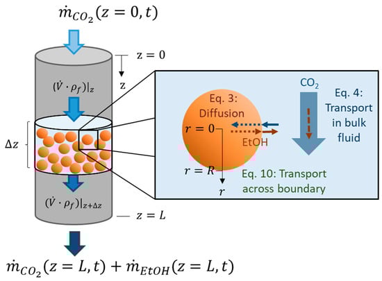 Supercritical drying of gel particles in a packed bed (z—axial coordinate of packed bed, z = 0—top of packed bed, z = L—bottom of packed bed, —slice of packed bed, —CO2 flow,—ethanol flow, —volume flow, —fluid density (mixture of CO2 and ethanol), r—radial coordinate of spherical gel particle, r = 0—gel particle center, r = R—gel particle radius, t—time).