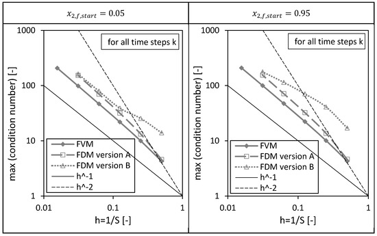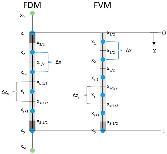The grid definition of the FVM leads to a slightly different grid compared to the FDMs (including different ) using the same number of nodes . This is important for the subsequent comparison of both methods.