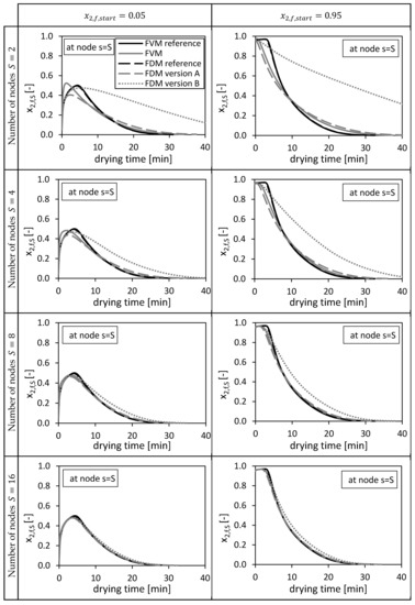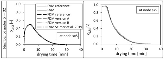 From Figure 3 it is obvious that increasing the total number of nodes increases the quality of the solutions for all three methods. For and , the FVM overshoots slightly the reference solutions in the first drying minutes due to a sharp increase of the molar fraction at this position (bottom of the packed) in the beginning of the drying process. The FDM version B prolongs the drying process compared to the reference solutions.
