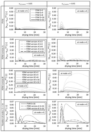 The resulting absolute deviations (at position ) between the solutions of the investigated numerical methods and their corresponding reference solutions are shown in Figure 4. In general, the deviations of the solutions from the fine reference solutions (Figure 3: in black), restricted to the corresponding coarser meshes, decrease with an increasing number of nodes, indicating convergence (Figure 4). The initial condition of the bulk fluid in the packed bed influences the height as well as the temporal distribution of the deviations (Figure 4). For high temporal changes (Figure 3, ) high deviations in case of FDM version A and FVM (Figure 4, ) can be observed. Even higher deviations at coarse grids () were observed for FDM version B due to a coarser approximation of the convective mass transport in the packed bed (Equation (25)) compared to version A (Equation (24)). The FVM shows smaller deviations compared to the FDMs, except for the usage of and nodes in case of where relative high deviations could be observed in the first drying minutes (Figure 4). These deviations are induced by the approximated boundary condition of the FVM at the bottom of the packed bed (Equation (44)). The interstitial fluid velocity and thus the ethanol flow at could not be evaluated at the cell interface and had to approximated by using the ethanol concentration at the final node to estimate the searched ethanol flow (Equation (44)).