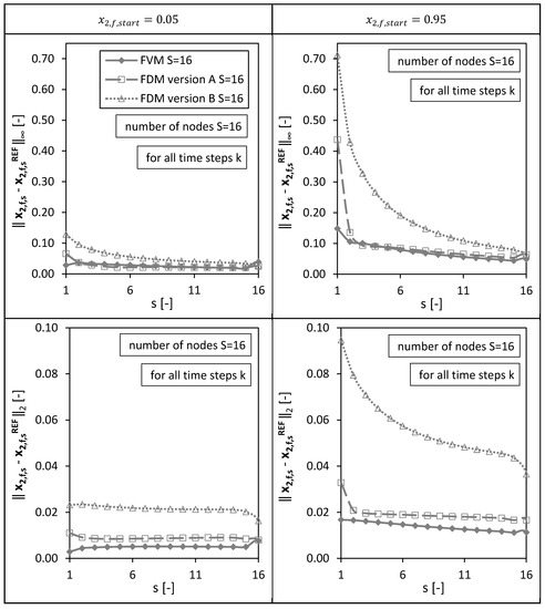 As observed already in Figure 4, the highest maximum absolute error ( error) at the last node for the case nodes and was given by the FVM due to the approximated boundary condition at . Nevertheless, the FVM shows small errors for all other nodes (similar to FDM version A) for both initial conditions (Figure 5). Overall, the smallest errors for all nodes (for all time steps and both initial conditions) were identified for the FVM. Version A of the FDMs shows generally smaller and errors compared to Version B (as already seen for the single node at the bottom of the packed bed (Figure 4)). For both errors, and , and all three numerical methods, the errors are generally higher for the initial condition compared to the case using due to an almost stepwise change of the molar fraction at the top of the packed bed () in the beginning of the drying process. The molar fraction changes here at the beginning of the drying process from nearly pure ethanol (component 2) to the autoclave entering pure CO2 (component 1). The errors are; therefore, higher at node compared to the other nodes.