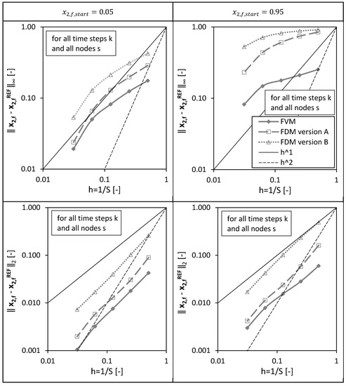 In a third step, the overall errors calculated for all spatial nodes of the packed bed height () and for all drying time steps () are presented in Figure 6 for different discretizations/grids () and both investigated initial conditions.
