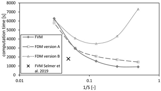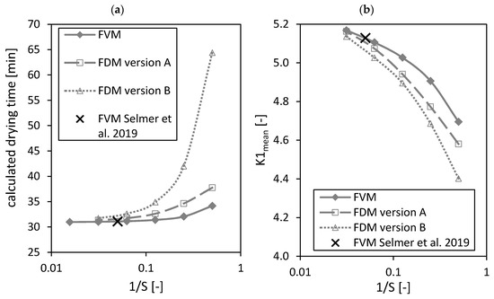 Calculated drying time (a) and dimensionless number (b) calculated by the FVM, FDM version A and B and the FVM, with the settings used in Selmer et al. 2019 [3] depending on the reciprocal of the number of nodes S using = 0.05. Calculation settings: N = 26, SREF = 64, Δt = 0.05 s (for FVM, FDM version A and B), Δt = 0.1 s (for FVM Selmer et al. 2019 [3]), S = 20 (for FVM Selmer et al. 2019 [3]).