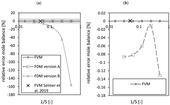 Relative error of the mole balance of the FVM, FDM version A and B and the FVM with the settings used in Selmer et al. 2019 [3] depending on the reciprocal of the number of nodes S using = 0.05 (a). Grey area is zoomed in on the right (b). Calculation settings: N = 26, SREF = 64, Δt = 0.05 s (for FVM, FDM version A and B), Δt = 0.1 s (for FVM Selmer et al. 2019 [3]), S = 20 (for FVM Selmer et al. 2019 [3]).