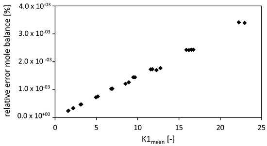 During the drying process no chemical conversion occurs and thus the balance in terms of mole fraction of ethanol and carbon dioxide were considered. The closure of the mole balance of ethanol is shown in Figure 8 in the form of the relative error (Equation (52))