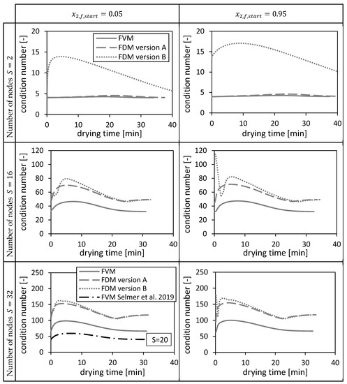 From Figure 7a it is obvious that a minimum can be reached for the calculated drying time by increasing the number of nodes . The black crosses in Figure 7 mark the settings of the FVM used in the previously published paper [3]. The calculated drying time from the previously published paper [3] is close to the found minimal value.
