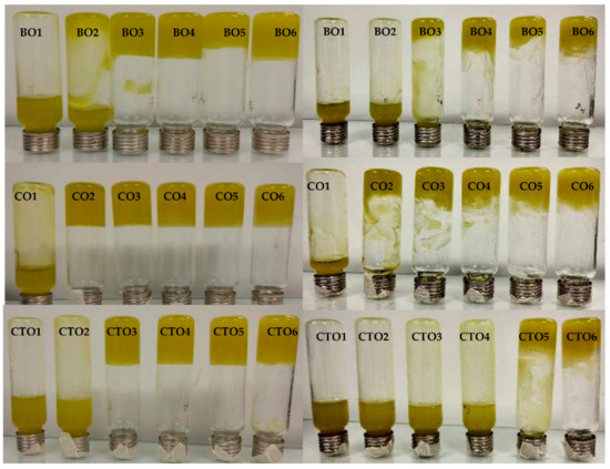 Beeswax organogels (BO) were able to self-stand, when inverted, for gelator concentrations higher than 2% (w/w), while candelilla organogels (CO), did so above 1% (w/w). On the other hand, carnauba organogels (CTO) showed self-supported gels above 3% (w/w) concentration (Figure 1). For all gelators, the critical gelation concentration values are in the same range of those found in previous studies, around 3% [5,11,12]. The observed changes in this variable were possibly caused due to the use of extra virgin olive oil exhibiting a long carbon chain, instead of the medium chain triglyceride (MCT) used in the mentioned works. The use of an oil phase with longer chain triglycerides (LCT), in conjugation with lower polarity and higher degree of unsaturation, may have steered to lower gelation concentrations when compared to reports using MCT oils [10,16,23].