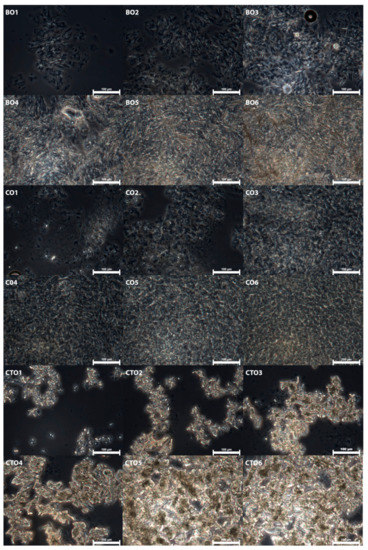 It is also possible to compare the obtained data from rheological analyses with DSC measurements (Table S2). There are some differences between the two tables, which is to be expected given the different nature of the assessment. In DSC, thermal analyses data are obtained through measurements of energy changes at the molecular level, while in the non-isothermal oscillatory rheology, data are measured through changes in the bulk structure. In addition, in DSC analyses, organogel samples are already structured before analysis, while in the rheological analyses, samples undergo the crystallization process followed by the melting process during analysis. Results showed that organogels above their gelling point evidenced similar temperatures (except for the CO organogels), when compared to ones produced below the gelling point for each organogel (2, 1 and 3% (w/w), respectively, for BO, CO, and CTO). From Table S2, it is possible to see that melting temperature values obtained by DSC measurements are in the same range as those obtained from the rheological tests. As mentioned before, in some samples, melting and crystallization events occurred at different stages, which can be grouped into major events (typically of higher enthalpies and melting/crystallization temperatures).