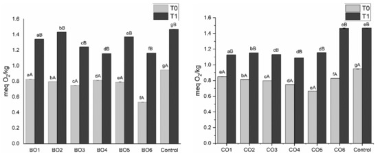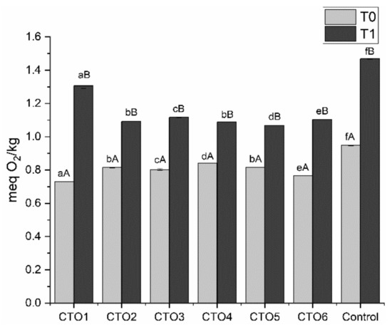 Peroxide analysis results for all organogel and control samples for both times of assessment T0 (0 days) and T1 (2 months). Different small letters indicate statistically significant differences between different concentration within the same organogelator, while different capital letters indicate statistically significant differences between different time assessments of the same organogel (p < 0.05).