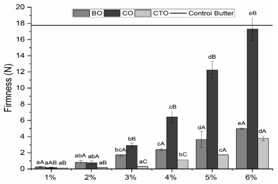 Texture analysis results for firmness (top), spreadability (middle) and adhesiveness (bottom). Different small letters indicate statistically significant differences between different concentrations within the same organogelator, while different capital letters indicate statistically significant differences between different organogels (p < 0.05). Extra virgin olive oil obtained values of 0.1035 N, 0.0061 N·s and 0.0199 N·s for firmness, spreadability and adhesiveness, respectively.