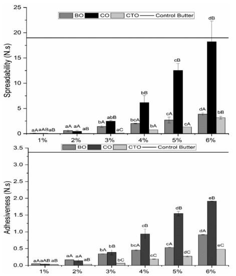 Mechanical properties’ results showed that with an increase in organogelator concentration, all the parameters (firmness, spreadability, adhesiveness) increased as well (Figure 4).