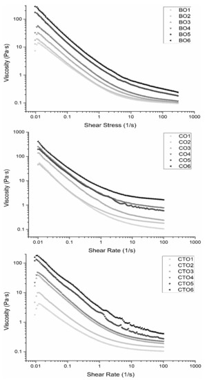 Thixotropy, yield stress and initial viscosity were used as an indirect measure of strength and structure build-up of the organogel samples. For increasing gelator concentrations, stronger three-dimensional networks are formed by aggregation of the gelator crystals, and thus, stronger structures are expected, which is confirmed by the results seen in Table 1 [7,38]. Rheological results are also in agreement with textural measurements (Figure 4), where higher values for all mechanical properties were obtained for higher gelators’ concentration. For these tests, CO organogels displayed the highest values, thus being the one with the most well-defined structure and higher 3D network strength.