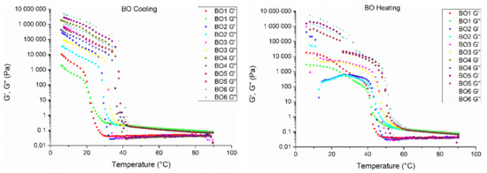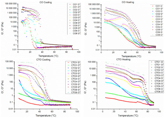 Temperature sweeps, heating and cooling stages are shown for all organogel samples. G’—Storage Modulus, G’’—Loss Modulus.