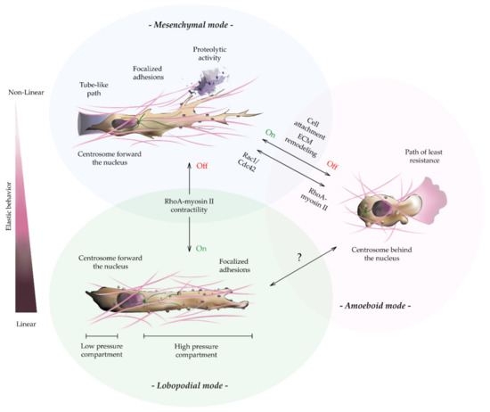 In this context, the increased ECM remodeling rates reported in mesenchymal-based locomotion locally modulates the elastic behavior of the substrate [157]. Therefore, cells moving within rigid, linear elastic 3D environments, form blunt cylindrical protrusions, termed lobopodia (Figure 4) [136]. This specialized mode of locomotion has been reported exclusively in fibroblasts and tumor cells across CDMs, dermis explants, or highly covalently cross-linked collagen matrices. In fact, the chemically induced loss of cross-linking in CDM-based hydrogels confers non-linear elastic properties to these matrices, triggering the phenotypic transition towards mesenchymal-like modes. Similarly, tumor cells moving in soft, non-linear elastic 3D collagen hydrogels can shift between lobopodial to mesenchymal-based migration [74,158]. Interestingly, lobopodial cells appear to adopt a mixture of both mesenchymal and amoeboid features. Mesenchymal cells can detect the inherent elastic behavior of materials and respond to it by increasing RhoA activity, in order to elicit this phenotypic switch. Namely, during the onset of lobopodia, RhoA-dependent myosin II contractility pushes the nucleus forward like a piston, increasing intracellular pressure [159]. This suggests that the nucleus physically divides the cell into two distinct compartments, the leading edge and the trailing end, maintaining an asymmetric intracellular pressure in between them (Figure 4). As described for amoeboid-like migration, this compartmentalized hydrostatic pressure drives cell motility through small blunt-ended blebs [160]. Furthermore, during lobopodial migration, no polarization of the Rac1, Cdc42, and PI3 kinases is observed as occurs in mesenchymal migration. Despite this, lobopodial cells exhibit robust cell adhesion and cell body polarization unique to mesenchymal locomotion (Figure 4) [161]. In fact, genetic ablation of Rac1 and Cdc42 alters the migration rate of lobopodial tumor cells, indicating that these kinases still influence lobopodia-based migration [139]. Intriguingly, either the knockdown of RhoA or the inhibition of myosin II-dependent contractility triggers a lobopodial-mesenchymal transition without affecting cell speed and persistence [162]. Thus, the choice between these migration phenotypes depends exclusively on the elastic behavior of the ECM and the internal balance of the RhoA-myosin II axis.