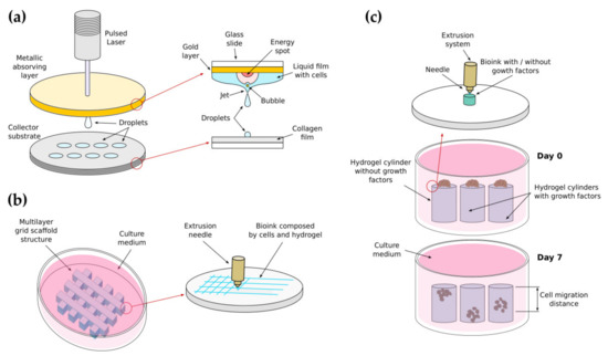 Laser-assisted bioprinting procedures (LAB) has been applied by J.M. Bourget et al. to create droplets of cells micropatterned as parallel lines [291]. The droplets, containing human umbilical vein endothelial cells (HUVECs) or HUVECs mixed with bone marrow mesenchymal stem cells (HBMSCs) were microprinted on a substrate layer made of type I rat collagen (Figure 5a). To this end, a pulsed laser excites the upper side of a glass slider that contains a gold absorbing layer. A thin printable solution containing the cells is spread on the bottom face of this slider, facing down towards a collector substrate. The energy provided by the laser pulses produces bubbles at the interface between the metallic layer and the liquid, generating a jet that allows the deposition of the droplets. Using this system, the authors studied HUVECs migration as a function of the distance between patterned cell lines and the presence of HBMSCs. They reported that co-printing HBMSCs reduces HUVECs migration capacity and randomness in the remaining migration events, thus promoting the creation of capillaries. This is of great interest to generate vascularized 3D tissue structures.