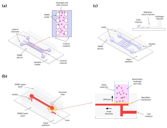 Hydrogel based microfluidic devices for cell migration assays. (a) Microfluidic device for studying H1299 lung cancer cell migration capability in collagen and collagen-Matrigel based hydrogel (Adapted from [42]); (b) microfluidic device for studying glioma cell alignment and migration capability in hyaluronic acid-based hydrogel (Adapted from [305]); (c) Microfluidic device for studying migration effects in neutrophil chemotaxis with a collagen matrix (Adapted from [306]).