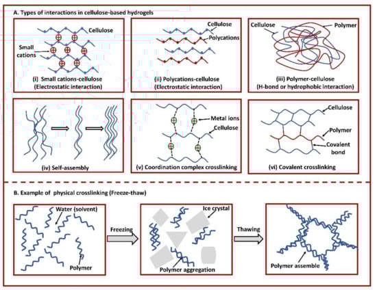 A stable 3D network structure of HG that is critical to hold a huge amount of water in their interstitials is achieved by crosslinking the constituting polymer chains [74,75]. Cellulose has hydrophilic functional groups, such as hydroxyl (−OH), that enable them to form both physical crosslinking (electrostatic interaction) and chemical crosslinking (covalent interaction using crosslinker). Depending on the materials used and modes of fabrication, different types of interactions are observed in CBHs, such as (i) small cations–cellulose (electrostatic interaction), (ii) polycations–cellulose (electrostatic interaction), (iii) polymer–cellulose (H-bond or hydrophobic interaction), (iv) self-assembly, (v) coordination complex crosslinking, and (vi) covalent crosslinking [76]. Figure 1A illustrates different types of interactions between cellulose molecules and other polymers or small molecules within a hydrogel matrix. All these interactions lead to the formation of the crosslinked structure of the hydrogels that prevents the complete destruction and dissolution of the CBHs during swelling. Cellulose-based hydrogels can be designed in a variety of physical shapes, including spherical, cylindrical, bead, blocks, microparticles, nanoparticles, and films by diverse methods of fabrication.