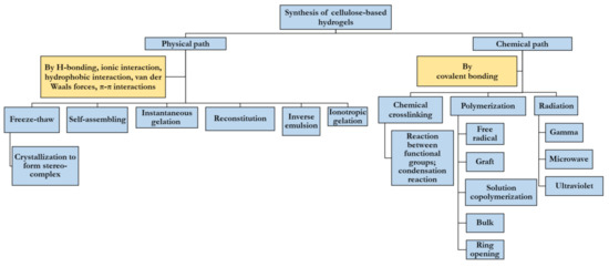 It is also a polymerization process, where no chemical-based crosslinker or catalyst is used. Instead of a chemical crosslinker as in the usual polymerization process mentioned above, it induces different types of radiations (such as gamma, electron beams, microwave, and ultraviolet radiations) to crosslink the polymer chains. Therefore, it is an environmentally benign synthesis process involving zero waste generation [60,61]. CMC-Na is a widely used derivative of cellulose, which is synthesized by gamma irradiation [53].